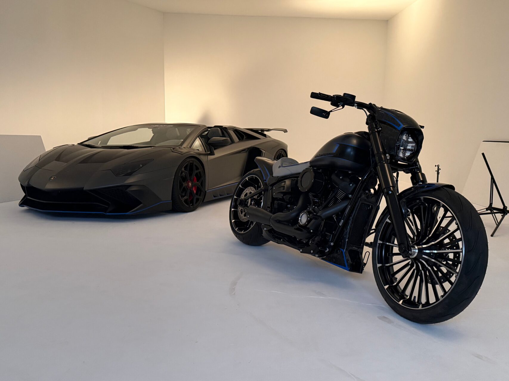 格別の存在感、Lamborghini AventadorSVとHarleyーDavidson BREAKOUT、スタジオ撮影!