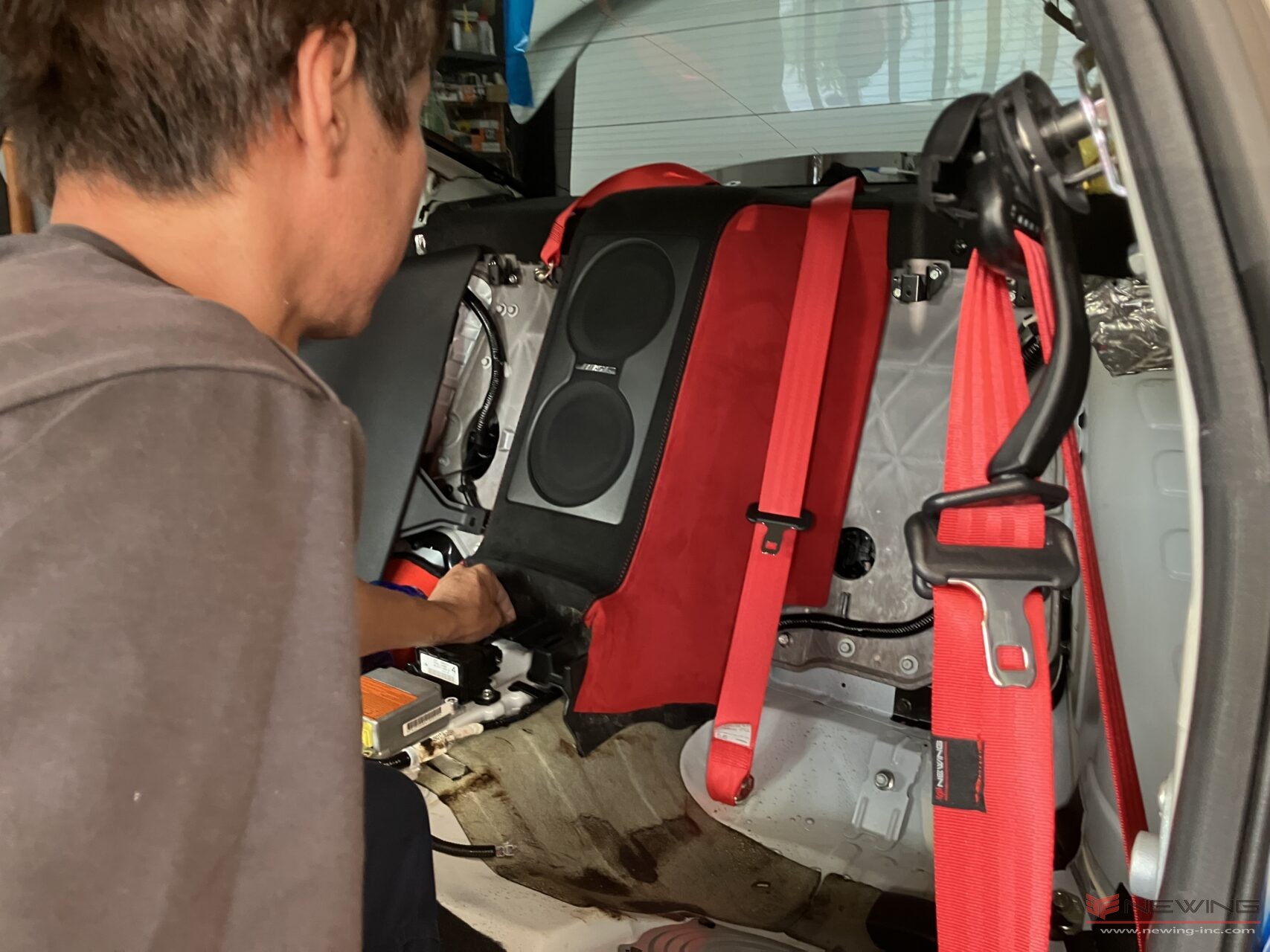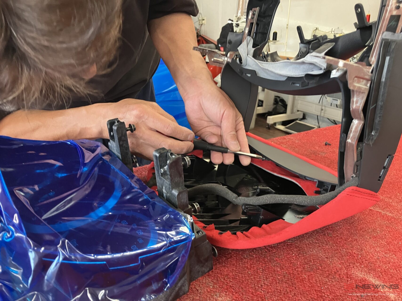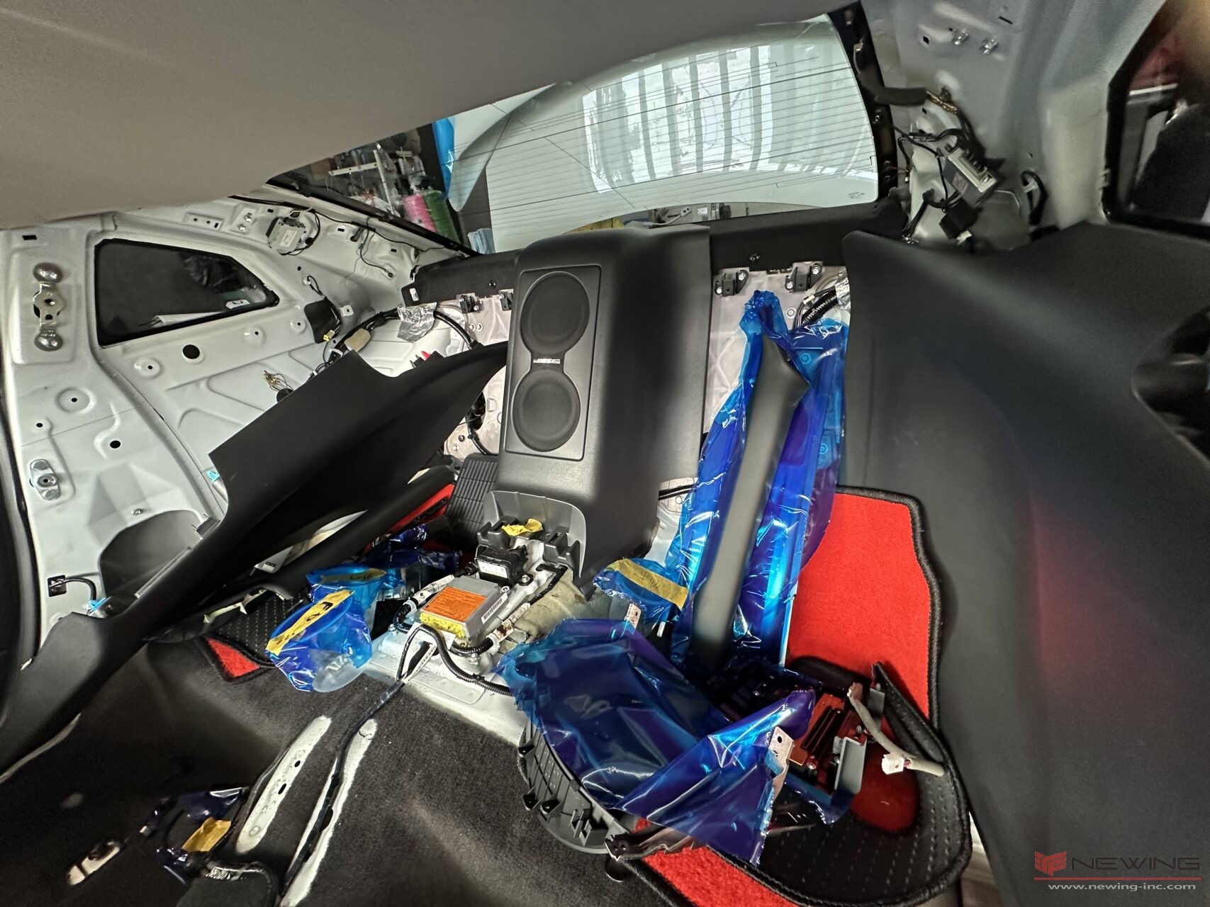 全てのパーツをバラしていき、車内がごちゃごちゃして見えますが何のパーツを置いているかは職人は分かっているのでご安心ください(*^^*)各パーツは傷が付かないように保護シートを巻いて保管しています。