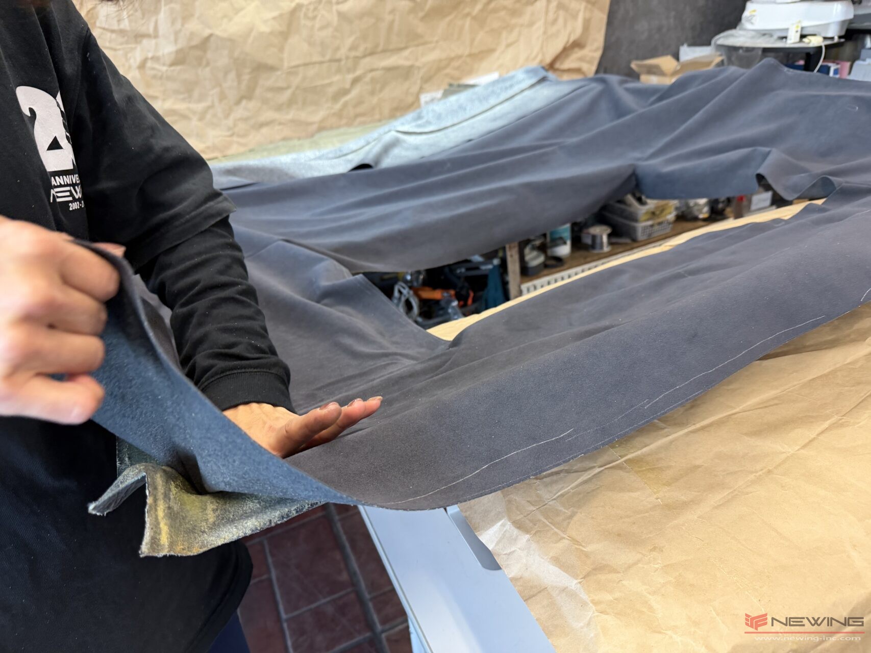 新しく縫製したウルトラスエードの生地を張っていきます。