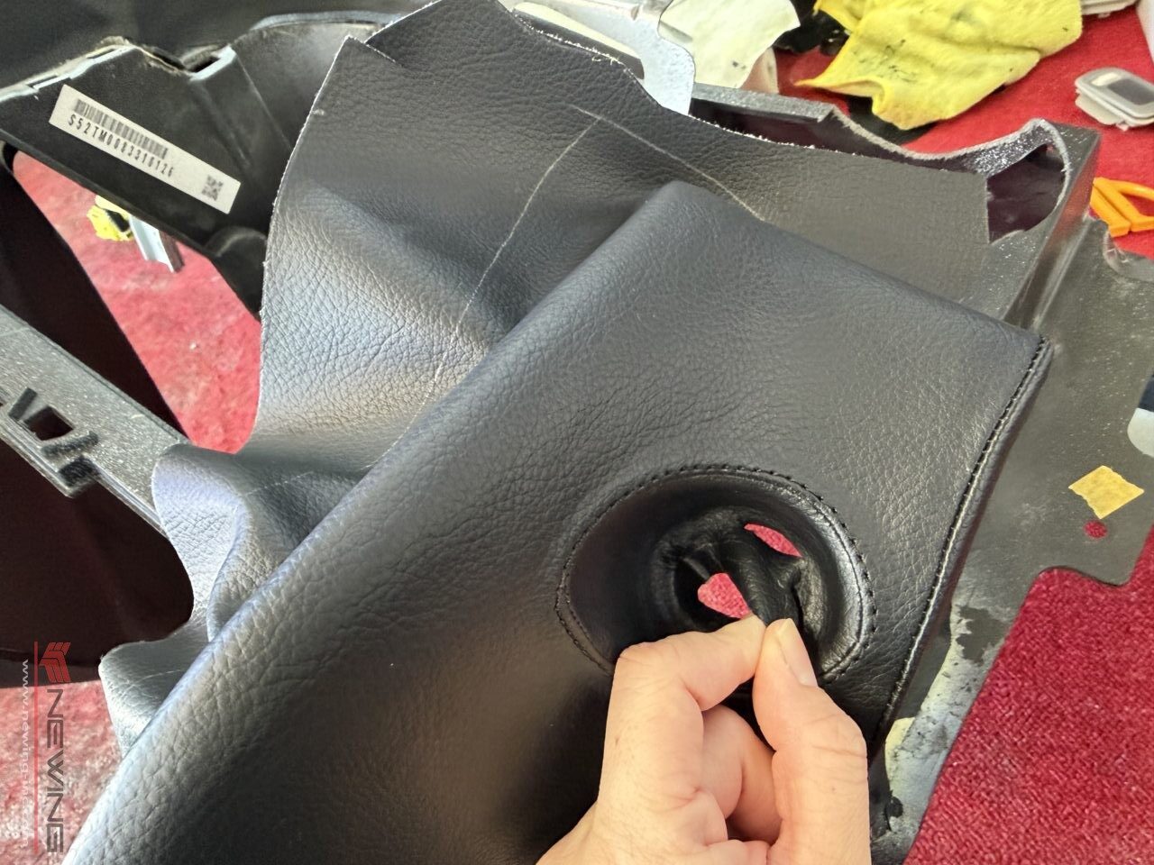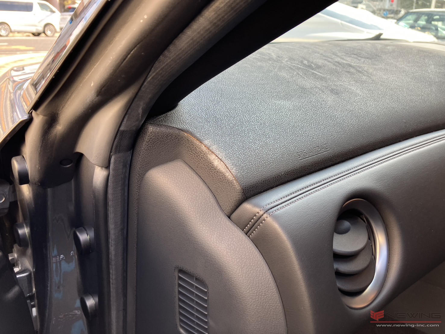 カスタムインテリアのプロたちによってダッシュボードの割れ目の修正と、純正の樹脂の模様と色にちかい生地を上からきれいに張っていきます!