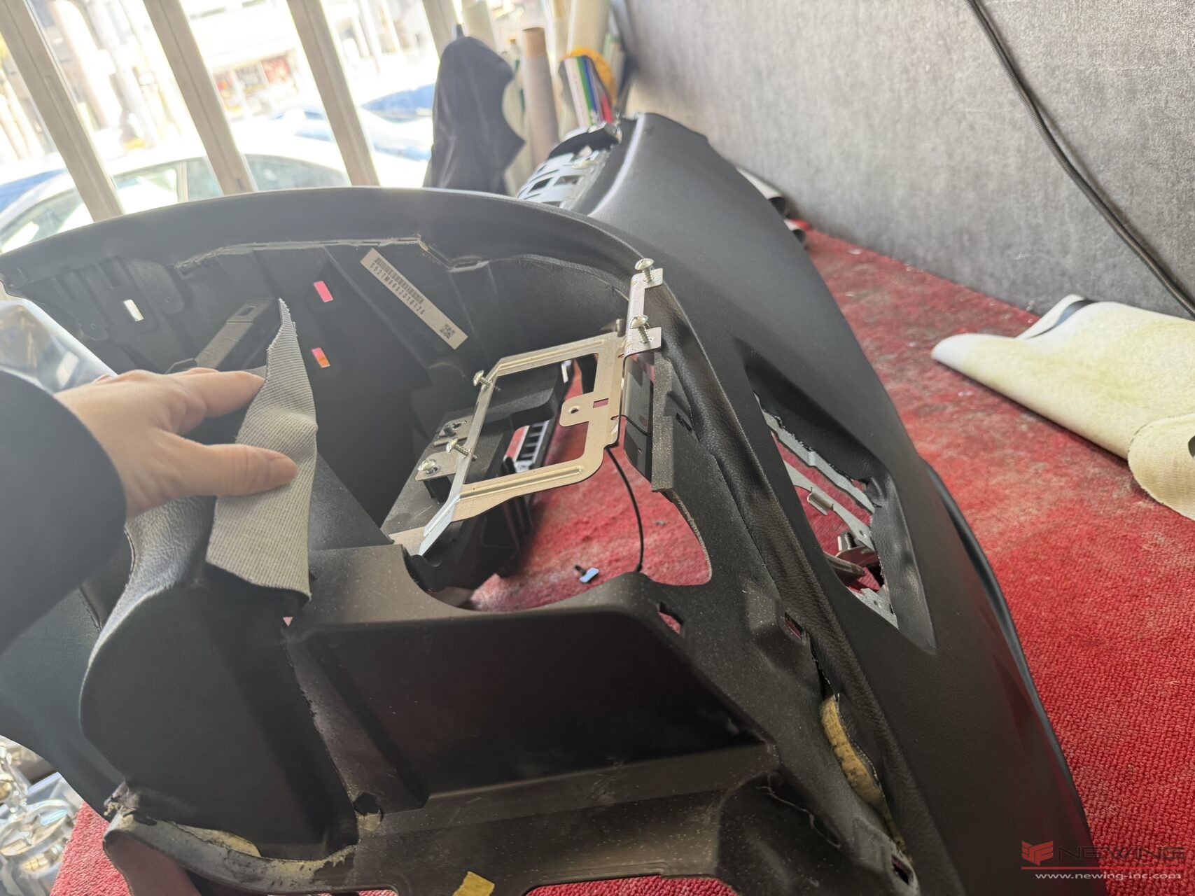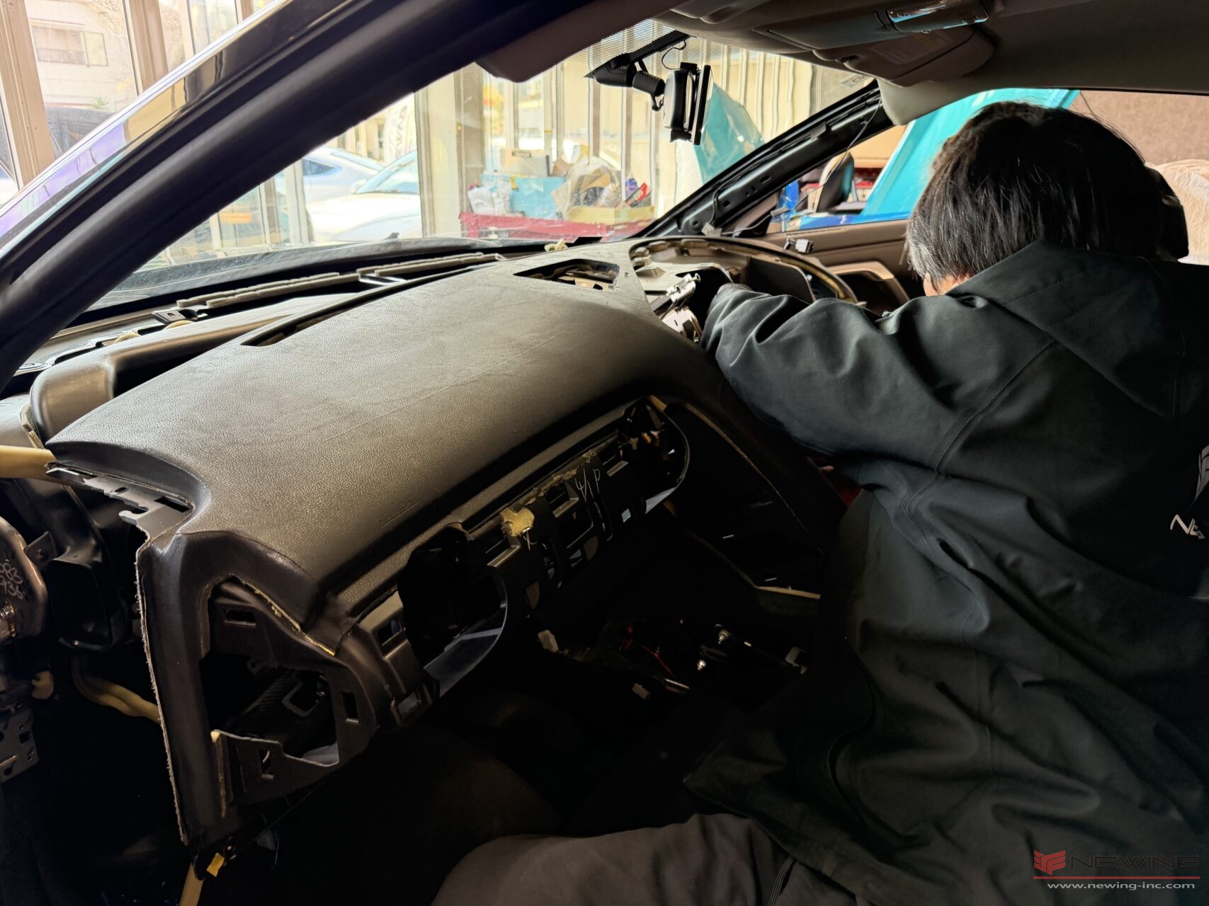 張り終えたダッシュボードを車内へと乗せていきます。配線もしっかり元に戻していきます!