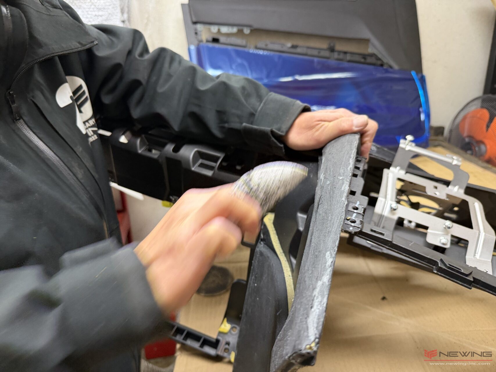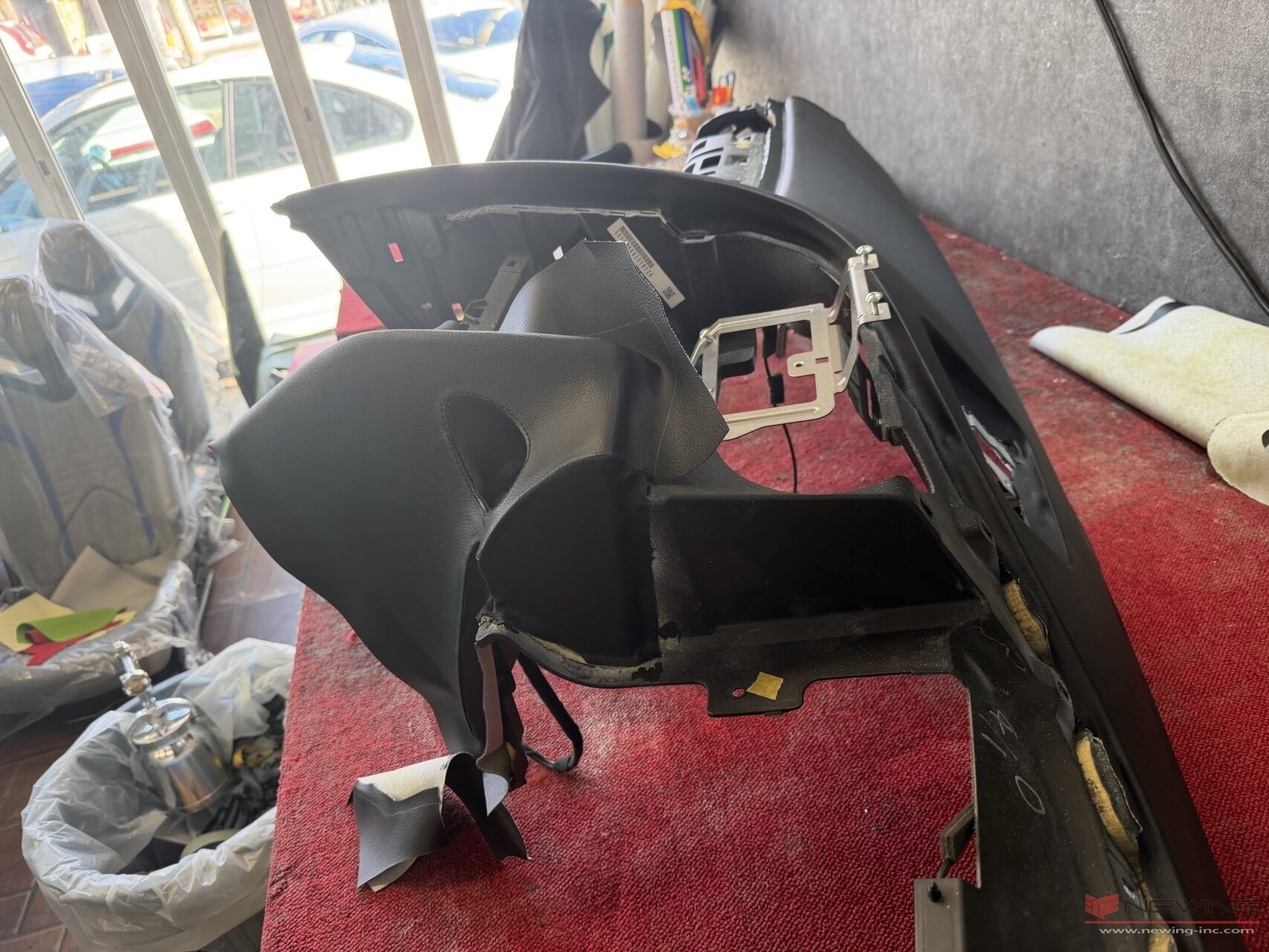 縫製が終わったら下地をしっかり施した先ほどのダッシュボード本体にボンドを吹き付けて生地を張っていきます。
