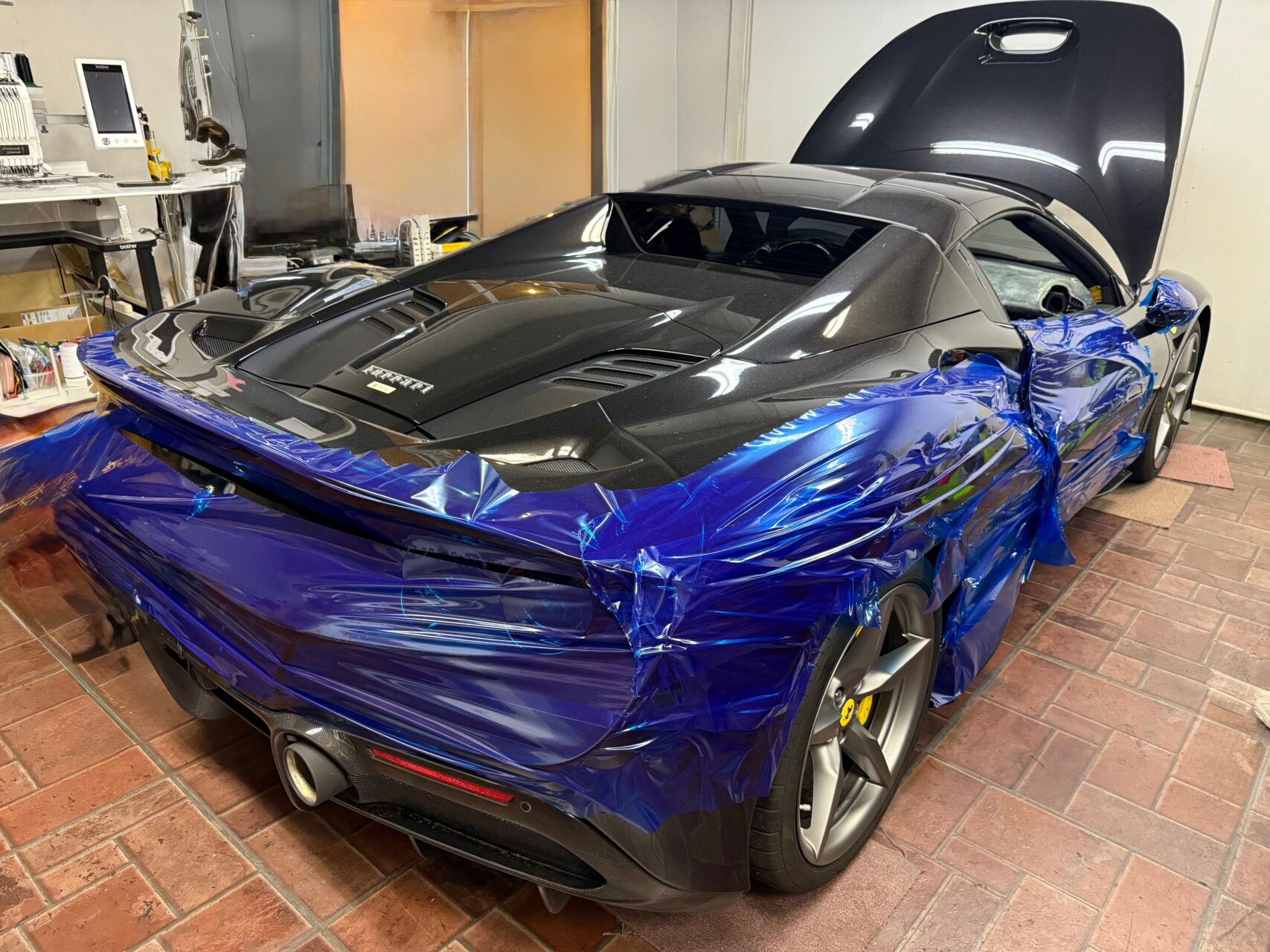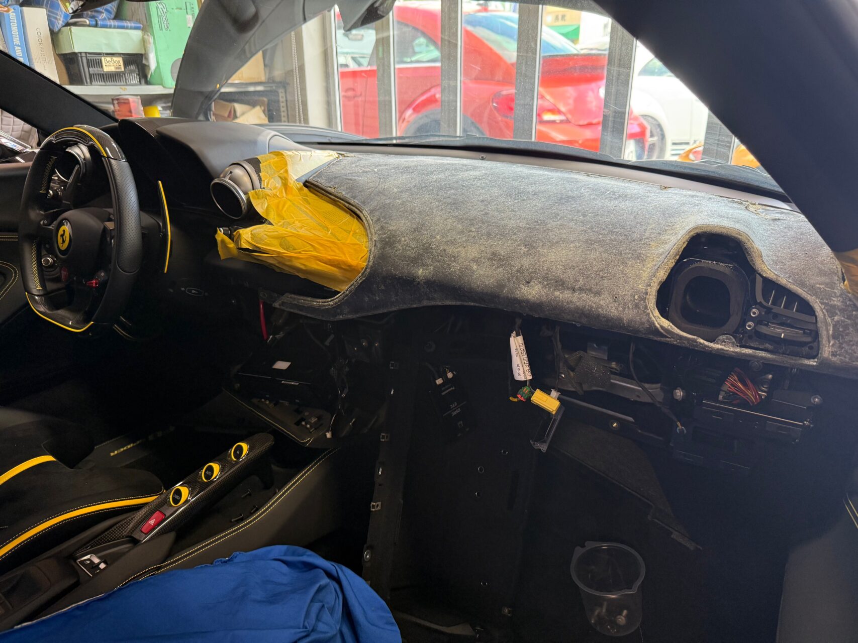 お預かりしておりますFerrariF8、今回NEWINGカスタムインテリアに与えられたミッションは、ダッシュの変形修正と修正した部分の張替(^^♪