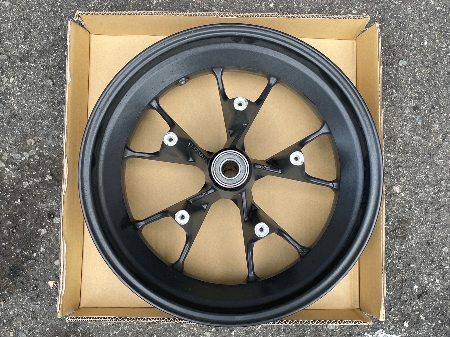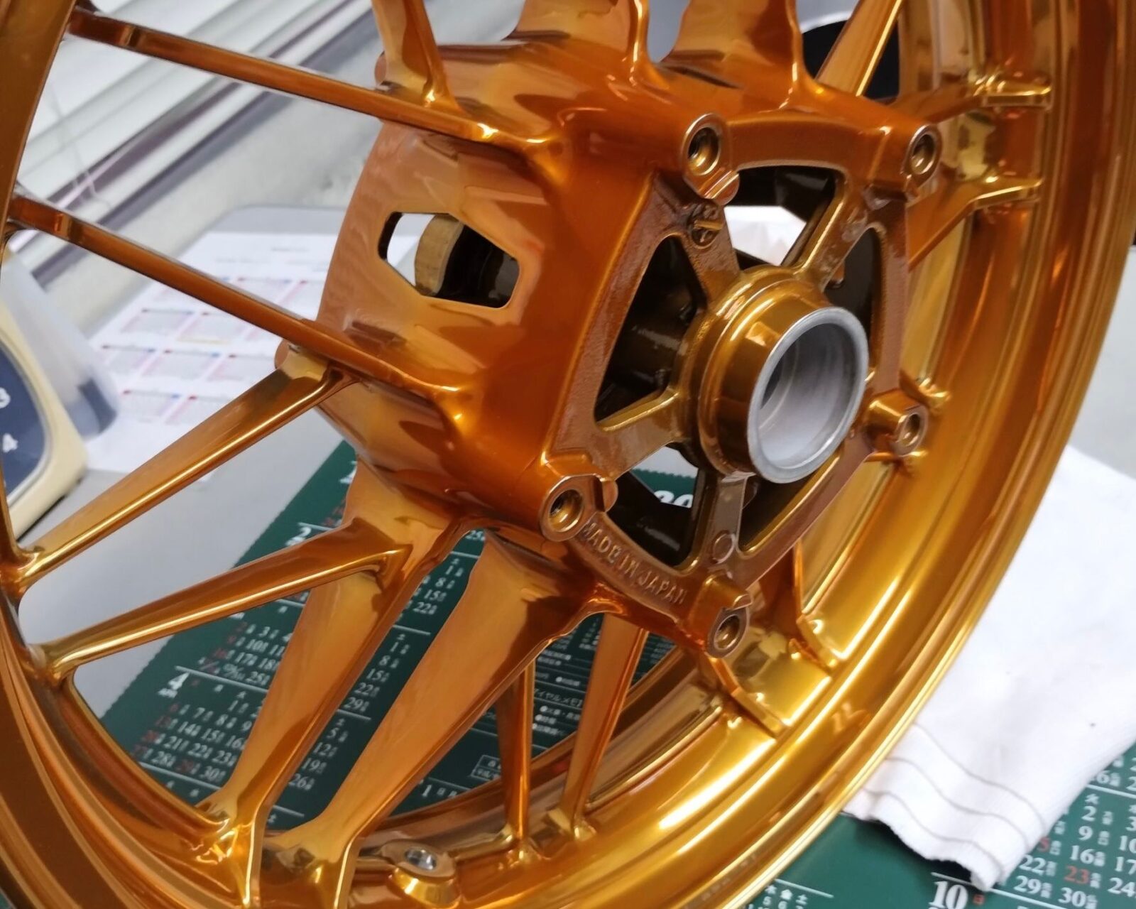 純正のつや消しBLACKホイールを、3次元バフでピカピカに磨き上げ、パウダークリア加工で仕上げます