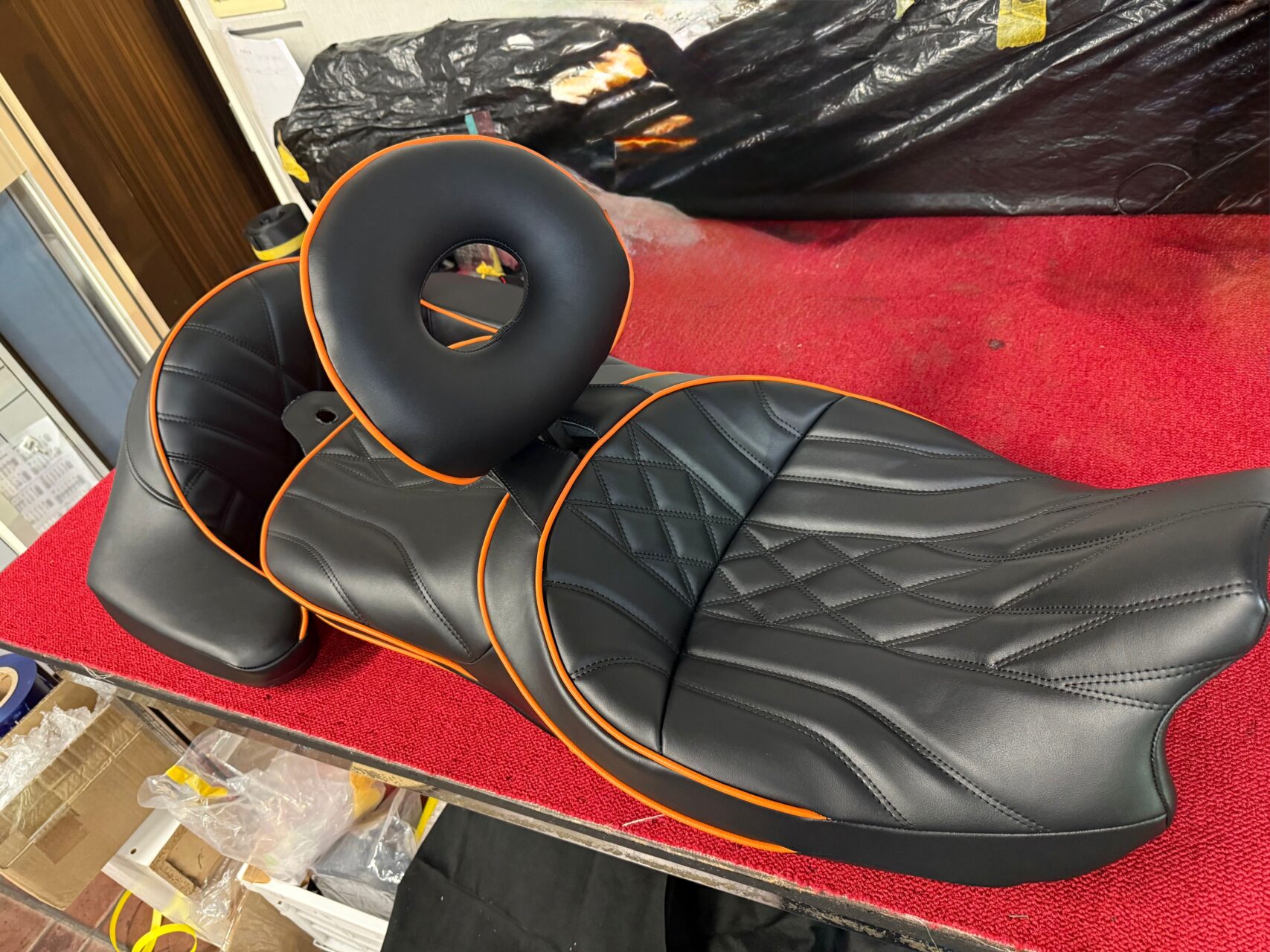 今回のミッションは、ステッチのデザインはこんな風で、シンプルにパイピングだけオレンジにして欲しいと言うご依頼(#^^#)