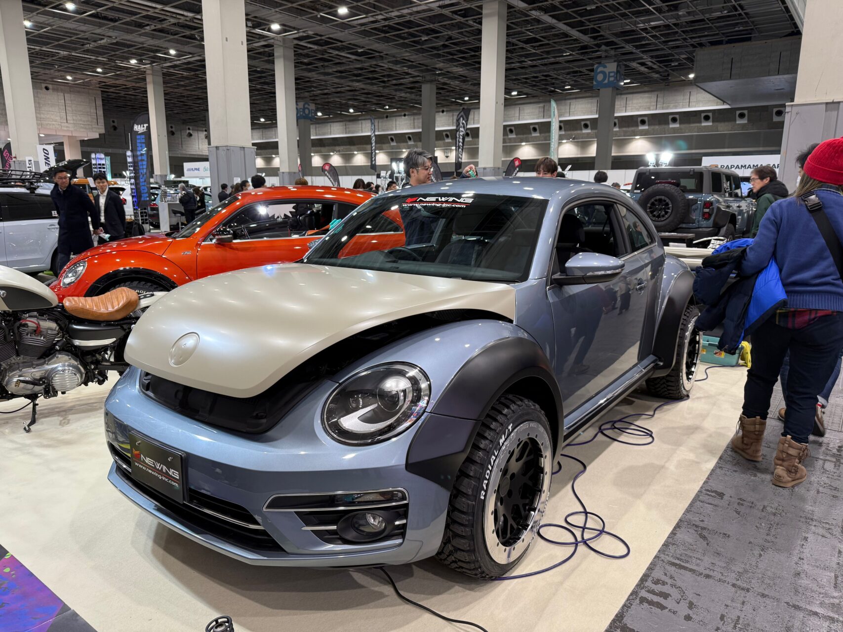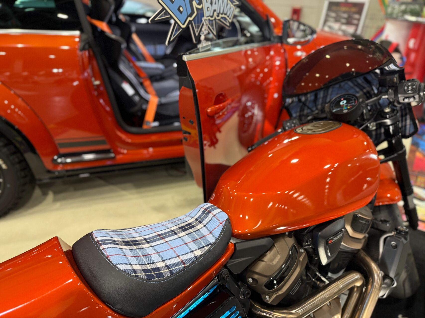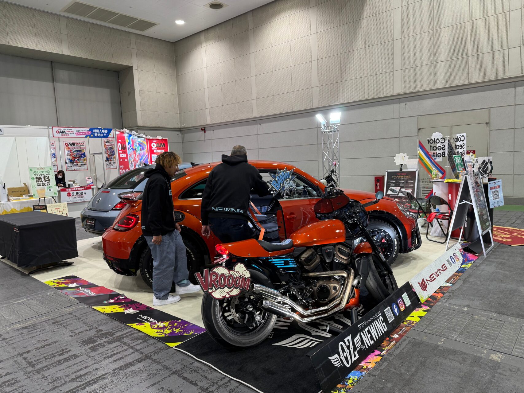 そして、今回の見せ所、NEWING・NEWINGカスタムインテリア・OZbyNEWING&リンダファクトリーのスーパーコラボ企画で完成展示してあるのが、色鮮やかなオレンジのTheBeetle『MadBug』、インテリアは勿論NEWINGカスタムインテリアによる、PORSCHEの純正生地を使ったシートの張替、そしてHarleyのシートとカウルの内側を同じ生地で張替ました(*´▽`*)
