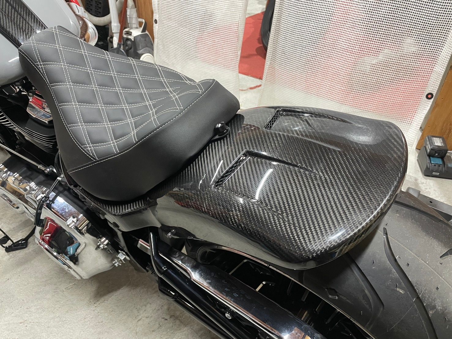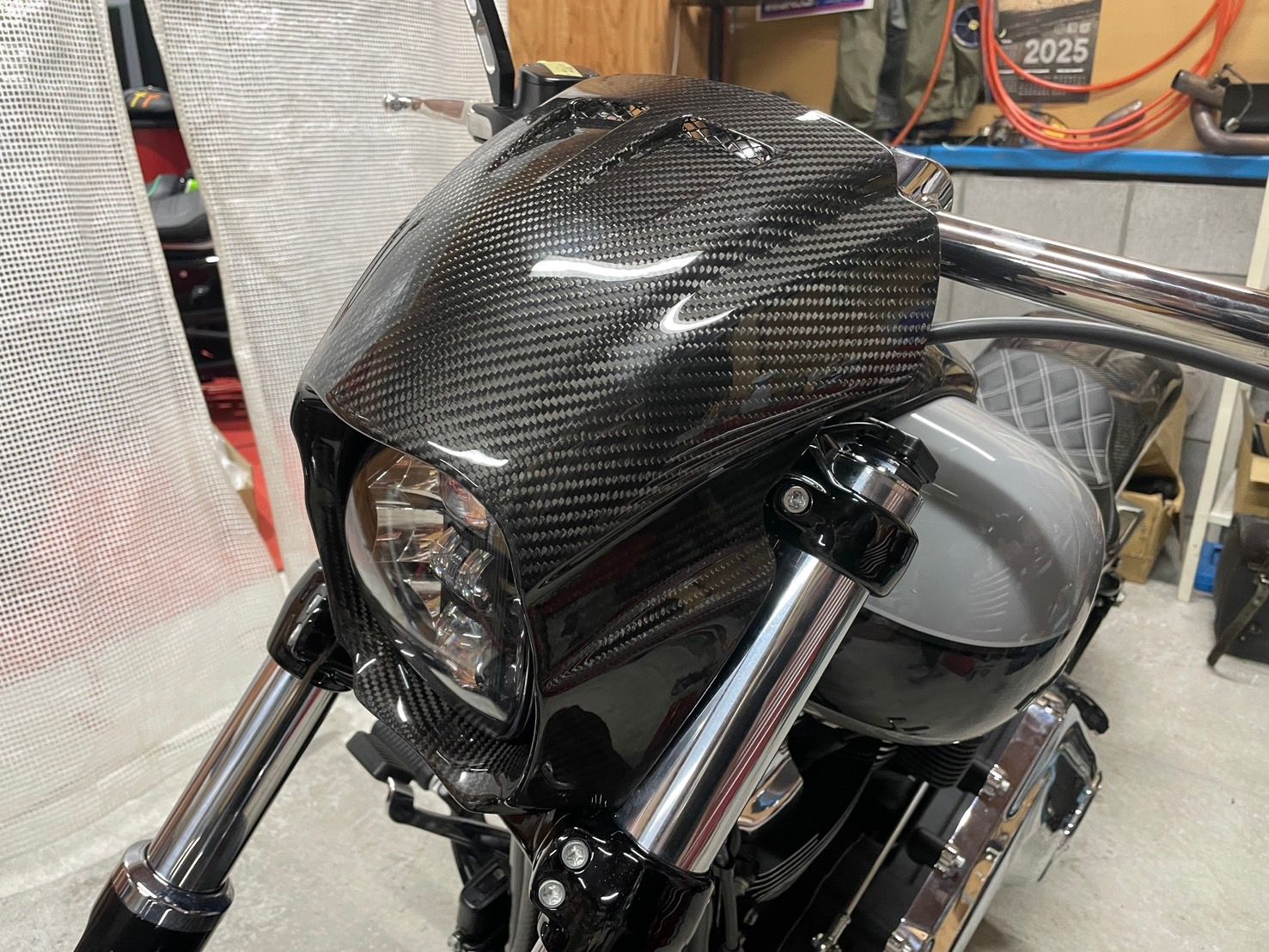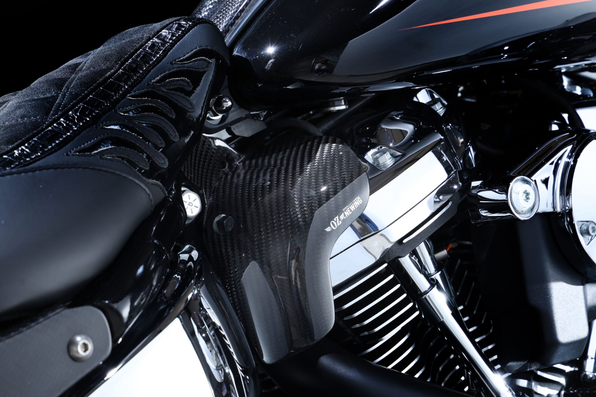 Harleyと言えばボディーカラーはBLACKのイメージが強いのですが、敢えてのタンクカラーGRAYに、OZオリジナルエアロパーツのDRYCARBONを合わせてみました、メリハリが効いて、DRYCARBONの美しさも強調されて、中々いい感じ(^^♪