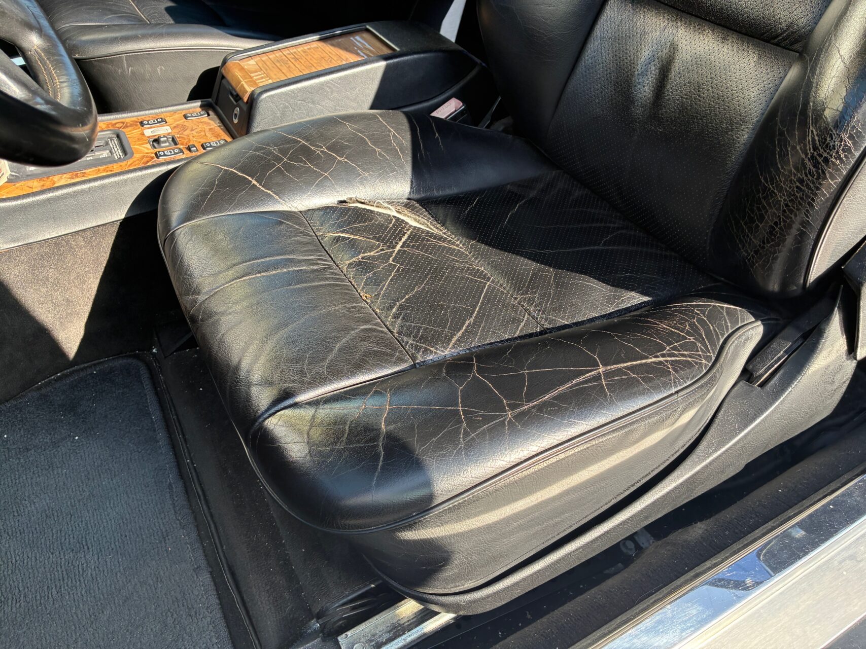 長年乗り続けているW126クーペ、運転席の破けと擦れを何とか直して、これからも長く乗り続けたいお客様に、シート座面の張替ミッション施工させて頂きました!(^^)!