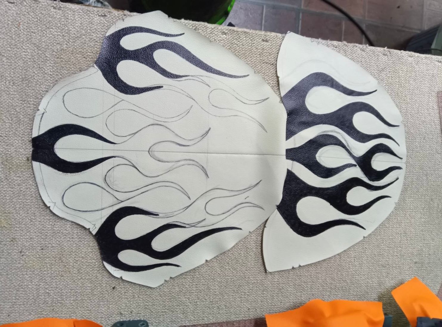 ファイアーのラインが崩れれば一気にチープに見えてしまい、張り込みが甘ければシワやヨレが出てしまう、ましてや同じBLACKの生地に見えますが、外生地と内生地で質感と色味をほんの少し変えているので、生地の特徴が違い伸び率なども変わってしまい、余計に型取りから縫製、最終の張り込みまで、何度も確認を繰り返しながら慎重に進めました(*´ω`*)