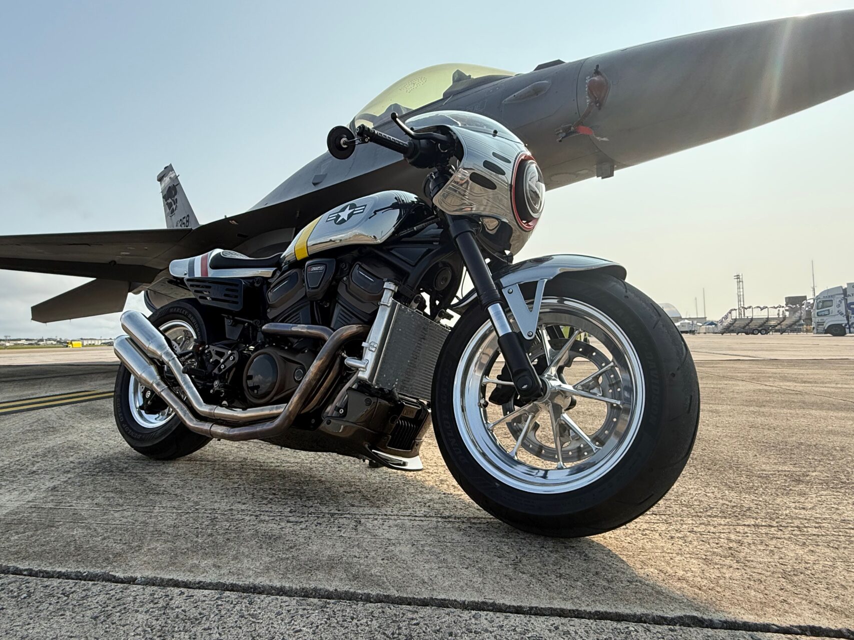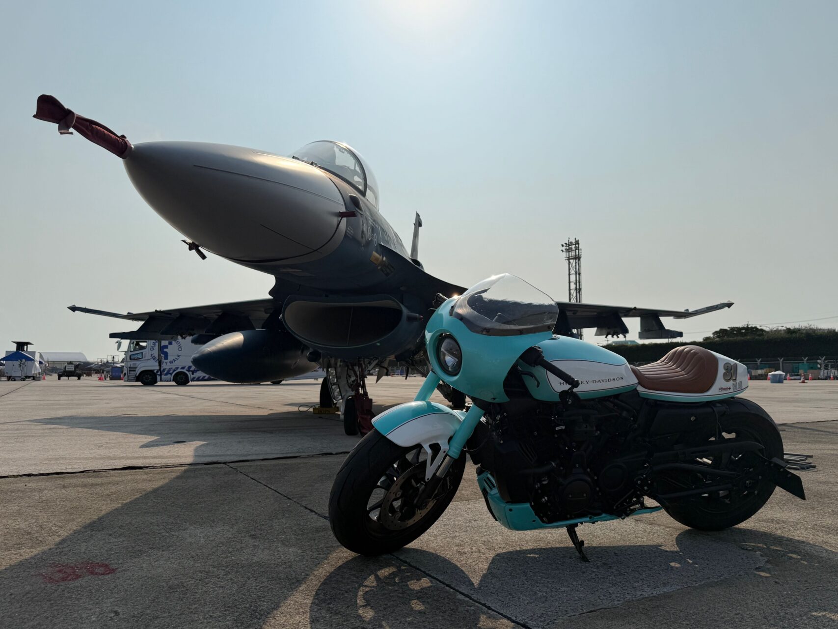 F-16とOZbyNEWINGカスタムハーレーの並びは、まさに圧巻の一言(^_-)