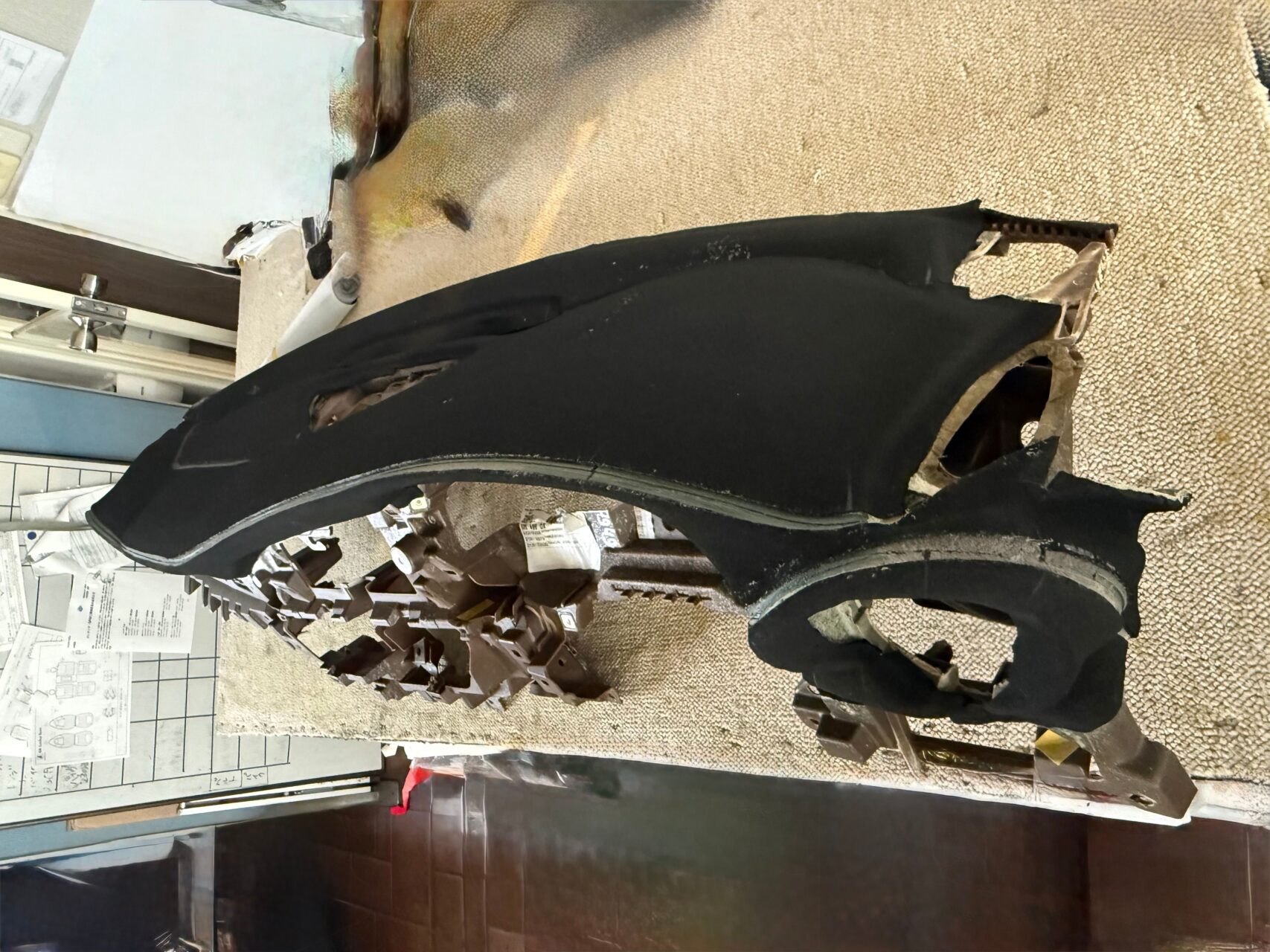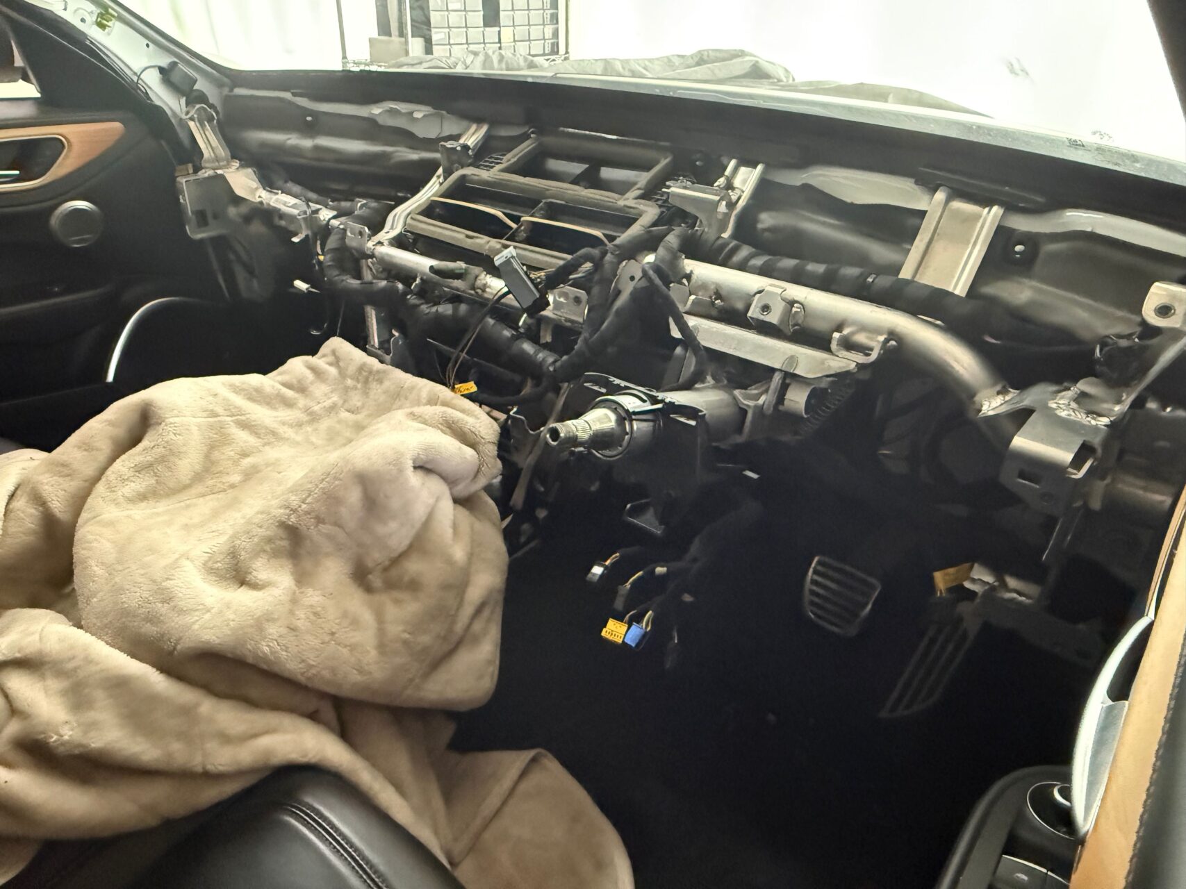 ダッシュを下ろした車内は、まさに”骨格”、普段は見えない配線や構造が剥き出しになり、作業の難易度と責任の重さを物語る(^o^)